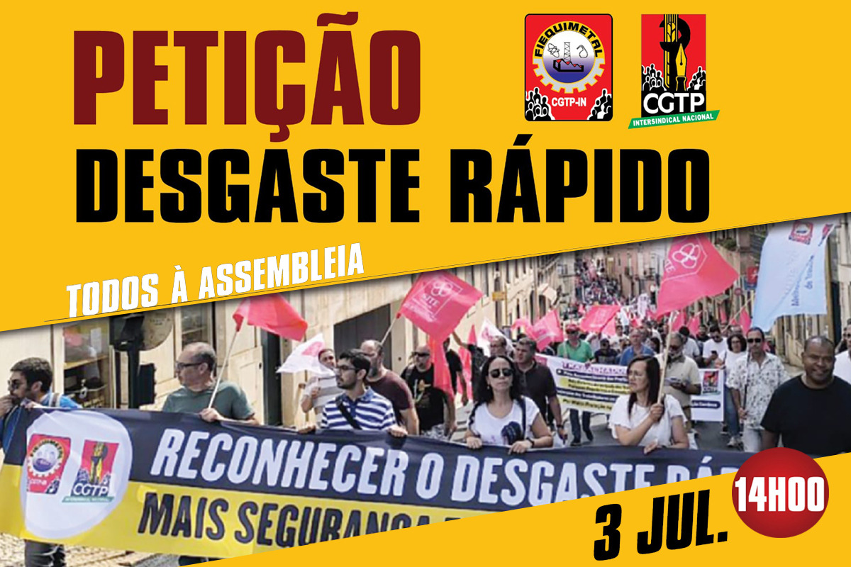 No dia 3 de Julho, quando será debatida na Assembleia da República a petição, promovida pela Fiequimetal, exigindo o reconhecimento de profissões de desgaste rápido na indústria, realiza-se uma concentração de trabalhadores, dirigentes e delegados sindicais, às 14 horas, junto do Palácio de São Bento.